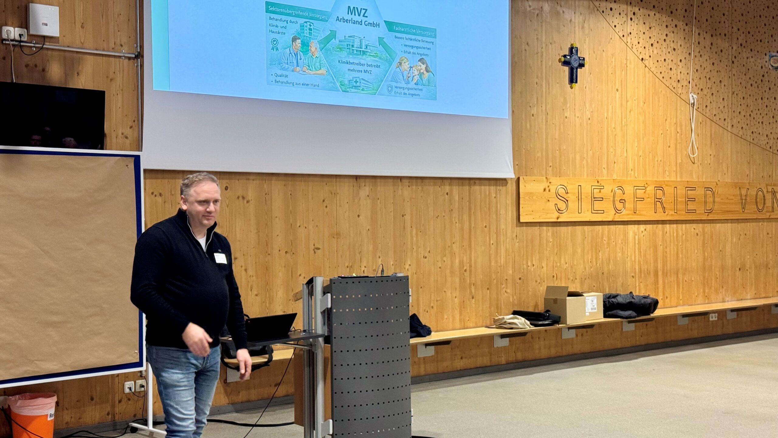 Auf bereits behandelte Themenschwerpunkte wie die allgemeinen Herausforderungen des Gesundheitswesens sowie die Notfallversorgung und Aspekte der stationären Behandlungsmöglichkeiten in den Arberlandkliniken folgten nun die ambulanten Leistungsangebote. Stellvertretend für das Medizinische Versorgungszentrum (MVZ) der Arberlandkliniken referierte Geschäftsführer Andreas Probst. Er stellte die Leistungen der Medizinischen Versorgungszentren an den Standorten in Zwiesel, Viechtach, Regen und Aldersbach vor und erläuterte das vielfältige Spektrum – von der Anästhesiologie über die Kinder- und Jugendmedizin bis zur Neurochirurgie. Zugleich betonte er, dass die Versorgung damit in den betroffenen Gebieten aktuell zwar noch ausreichend gedeckt sei, die Finanzierbarkeit und bürokratische Komplexität dies jedoch teilweise erschwere.